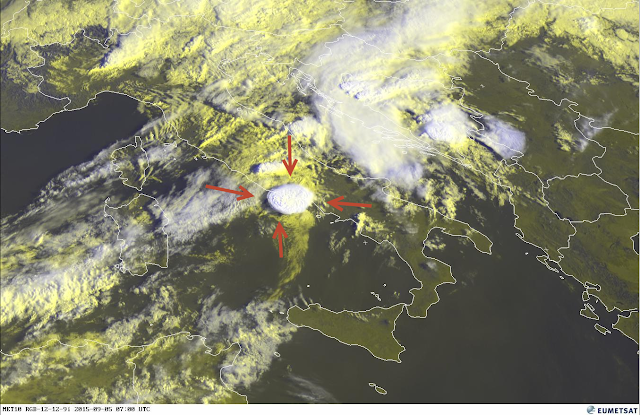Dnes v průběhu dne klimateroristé zahájili šlehání extrémně silné bouře nad Středozemním mořem, a vodu zvednutou do oblak umělým procesem hodlají spustit na jižní Itálii a Balkán, kde vydali varování před bleskovými záplavami, záplavami a sesuvy půdy. Po celý den veškeré zobrazovače srážek vydávají velice podivná zobrazení, musejí se tam dít hrozné nevídané věci, které se už do zobrazovačů barevně nevejdou, s tak intenzívními procesy se prostě nepočítalo... uvidíme, co to přinese.