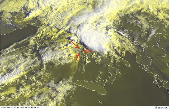 Mimořádně silná bouře právě probíhající nad jižní Itálií a Balkánem (9. 9. 2015)