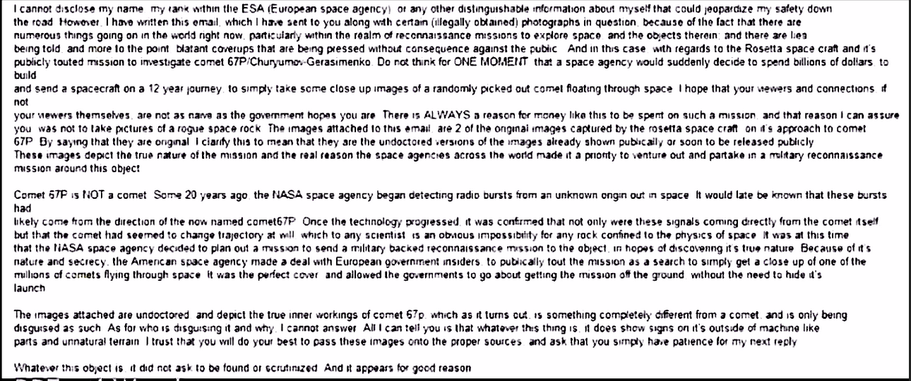 „Kometa 67P není kometa. Asi před 20 lety NASA začala detekovat radiové signály neznámého původu z vnějšího vesmíru. Později se ukázalo, že signály pravděpodobně přišly ze směru této komety, nyní nazývané 67P. Na jejím povrchu jsou známky strojových součástí a nepřirozený terén.“